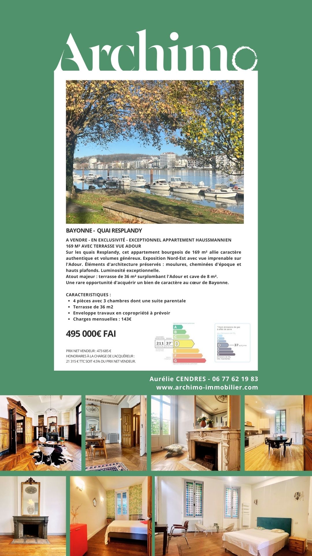 A VENDRE – EN EXCLUSIVITÉ – EXCEPTIONNEL APPARTEMENT HAUSSMANNIEN 169 M² AVEC TERRASSE VUE ADOUR